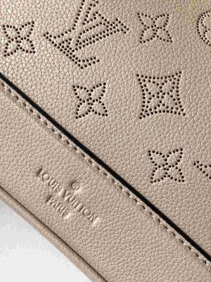 The bag features a Monogram perforated pattern on embossed leather, highlighted with eye-catching metal pieces to enhance the bucket bag shape. It has a drawstring closure for secure storage and a zippered inner pocket for valuables.