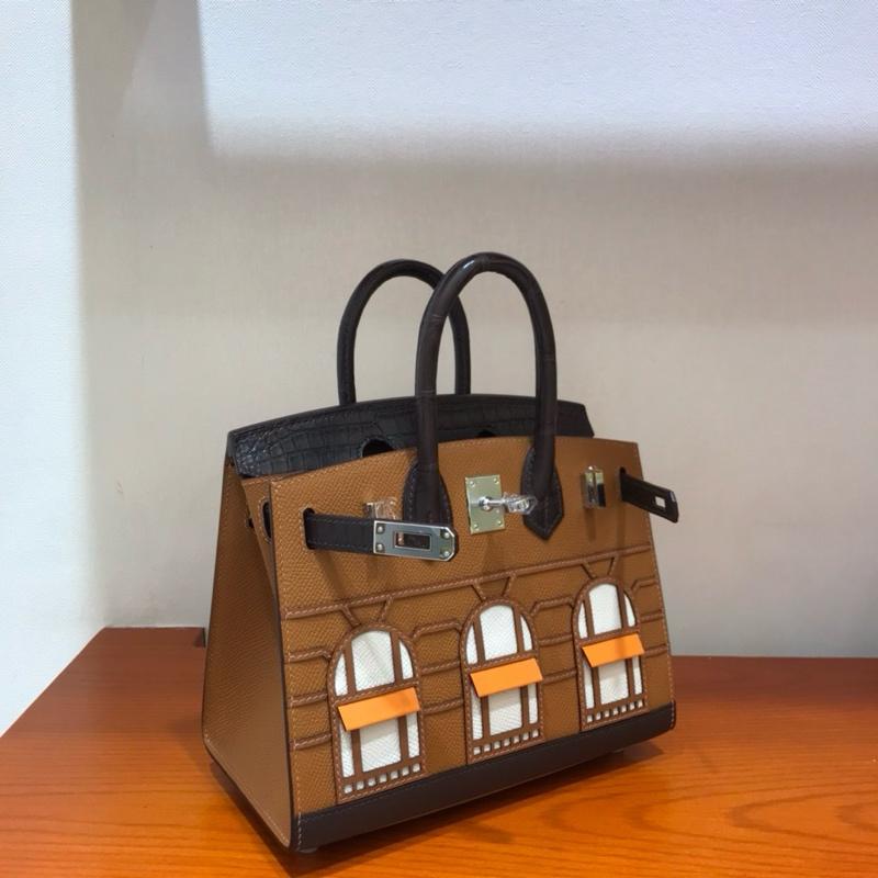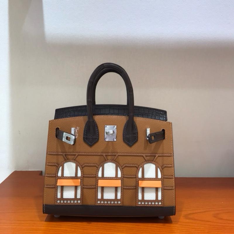 With a magnificent display of artistry, the Day Hermès Faubourg Birkin depicts the storefront at 24 Rue du Faubourg Saint-Honoré in Paris as it is seen in daylight. The roof, rendered in Ébène Matte Alligator, contrasts beautifully with the walls of Gold Madame. The stonework is detailed in Brûlée Sombrero over a base of Ébène Sombrero. The arched glass windows are depicted in Craie Epsom.