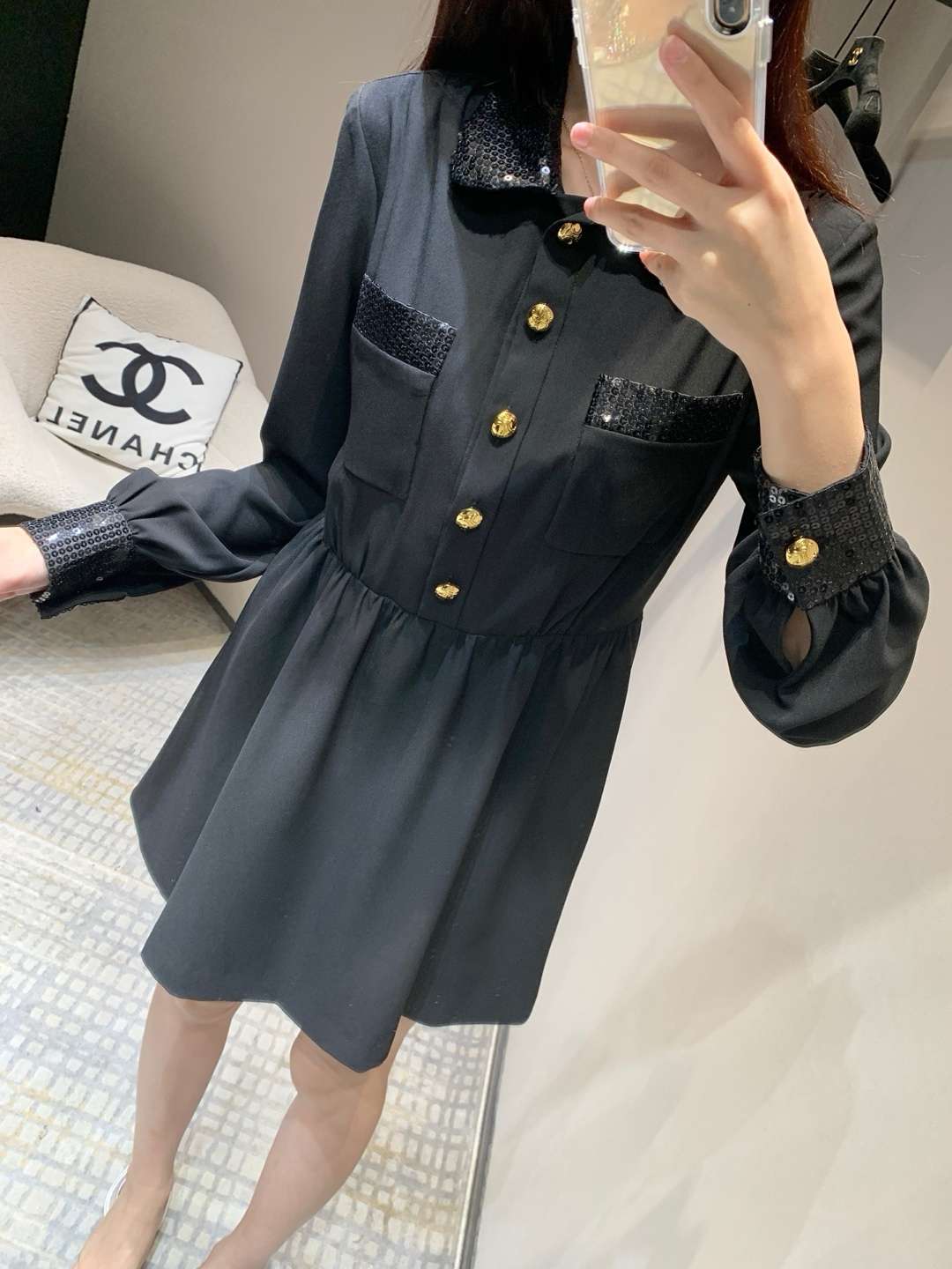 • Celine 25SS Early Spring New Collection – Sequin Collared Dress, exclusively crafted in a high-end version! Handmade sequin-embroidered pleated waist dress, exuding elegant fashion. The sequin collar and cuffs are paired with decorative pocket edges, creating a harmonious and captivating look with stunning details. The golden Arc de Triomphe buttons add a signature brand touch. With a moderate length and pleated waist design, it perfectly blends sophistication and charm.
